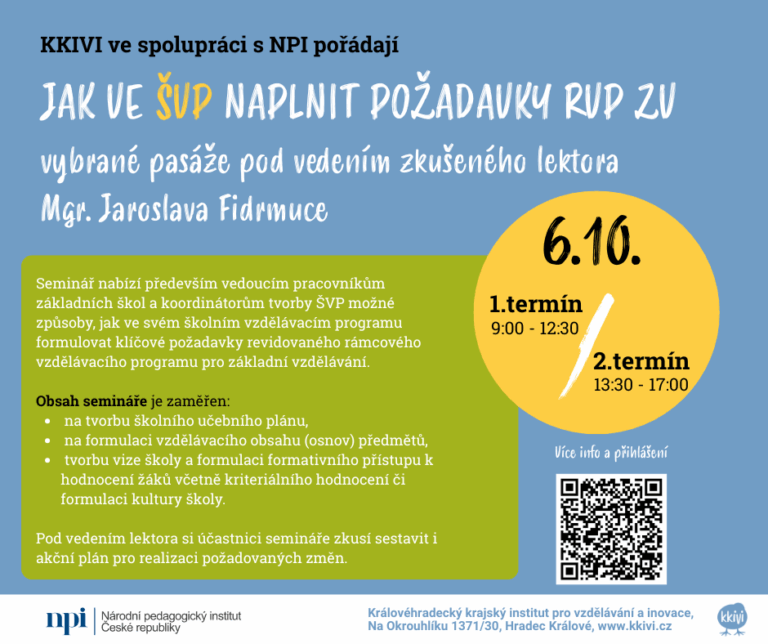 Zveme vás na prakticky laděný webinář, který vám pomůže zorientovat se v revizi RVP PV a jejím dopadu na školní vzdělávací program. Získáte konkrétní doporučení, vzorovou předlohu ŠVP a koncept evaluace MŠ.