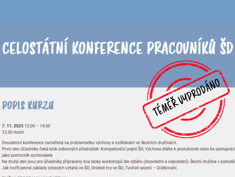 Celostátní konference pracovníků školních družin je téměř vyprodaná, pokud máte zájem se připojit, neváhejte prosím. Zdá se, že v nejbližších