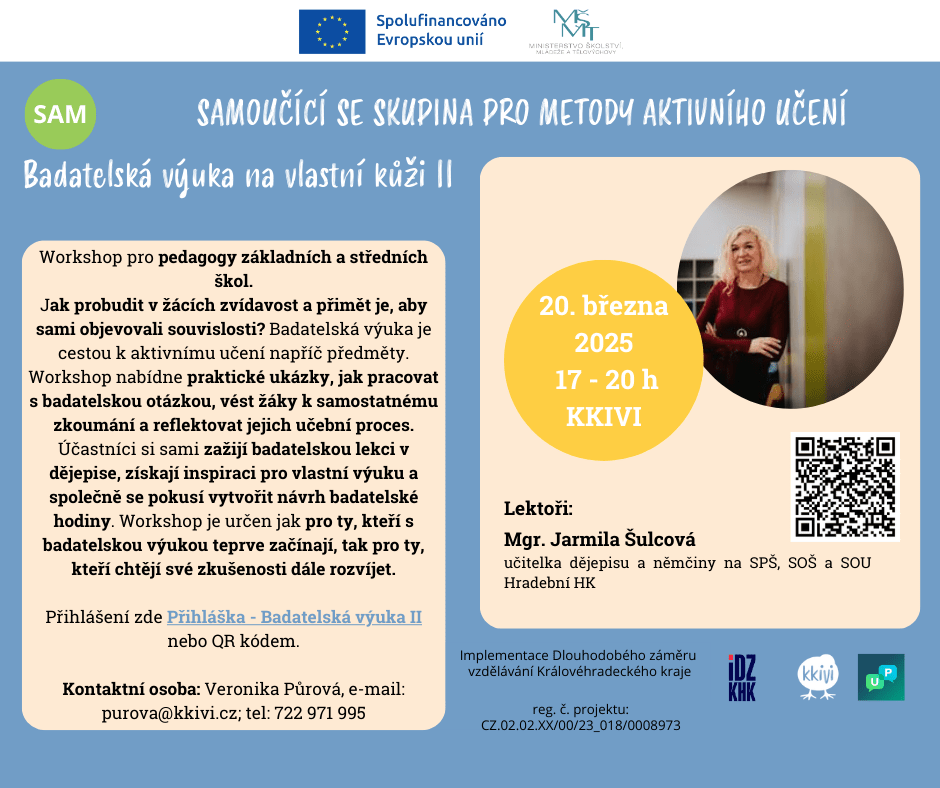 Co Vás čeká? Praktické ukázky práce s badatelskou otázkou, vedení žáků při samostatném zkoumání a reflektování jejich učebního procesu. Zažijete badatelskou lekci v dějepise, odnesete si inspiraci pro vlastní výuku a budete mít možnost vytvořit návrh vlastní badatelské hodiny. Setkáte se s kolegy z jiných škol a budete moci sdílet svoje tipy do výuky.